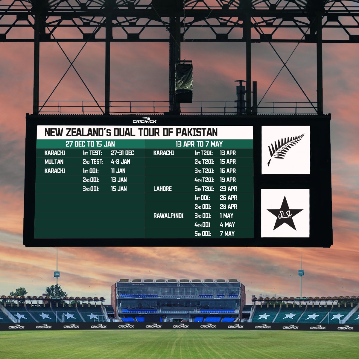 Schedule for New Zealand tour of Pakistan: